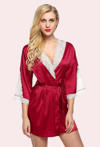 Our Intimate Nights and Daytime Elegance Robe – a versatile and luxurious garment designed to seamlessly transition between moments of intimate allure and daytime sophistication. Revel in the exquisite comfort and style this robe brings to both your private and public moments. The Intimate Nights and Daytime Elegance Robe features a timeless silhouette, enhanced with delicate lace accents that add a touch of romance. The thigh-grazing length adds a playful flair, allowing you to embrace a sen...